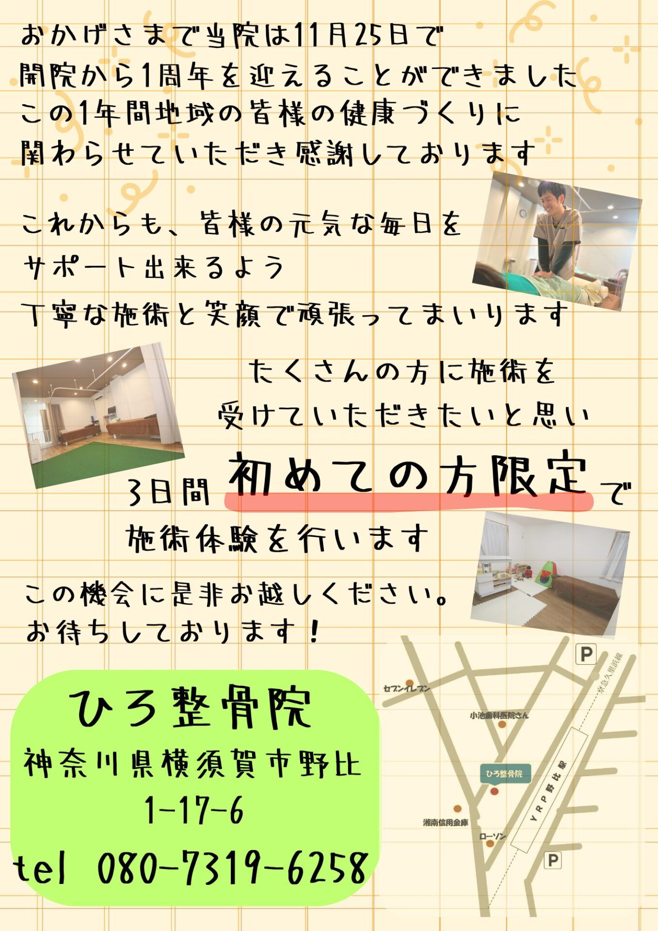 それに伴い、11月23(日),24(月),25(火)の3日間、初めての方限定で施術体験を行います。